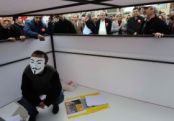 Kutu, Cumhuriyet Meydanı’na kadar taşındı. Yol boyunca ellerinde AK Parti aleyhine pankartlar taşıyan grup, geniş güvenlik önlemleri altında Cumhuriyet Meydanı’na alındı. Burada da slogan atmaya devam ettiler. Konuşmaların ardından kutunun kapağı açıldı. İçine giren bir kişi, sembolik gemiler ve para sayma makinesi çıkararak gösterdi.